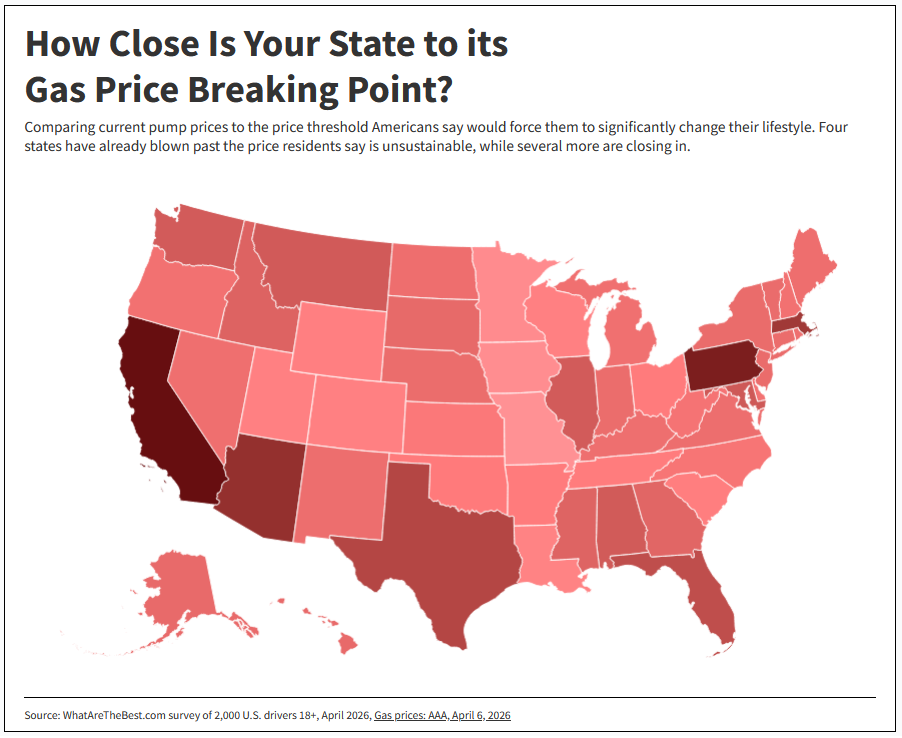 We wanted to know how close Americans are to being driven to their financial limit, what gas price would force them to fundamentally change their lives, and who they hold responsible. So we surveyed 2,000 U.S. adults across all 50 states. The findings suggest the breaking point isn't hypothetical for everyone. Some states have already crossed theirs, and others are close behind.